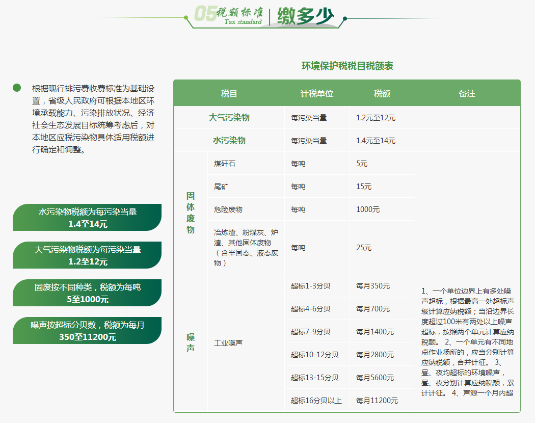 征稅項目指《環境保護稅法》所附《環境保護稅稅目稅額表》、《應稅污染物和當量值》規定的大氣污染物、水污染物、固體廢物和噪聲4類應稅污染物。